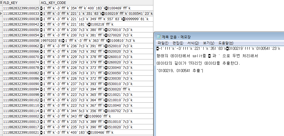 -- @은 특수문자로 대체해주세요.. 못만들겠어요.. 샘플데이타가 더힘듬.. WITH T AS ( SELECT 1 FLD_KEY ,'123456A`234@5678@0530020' ACL_KEY_CODE FROM DUAL UNION ALL SELECT 2,'1234562`2345678@0530021`0530022' FROM DUAL UNION ALL SELECT 3,'1234563`23456@78`l' FROM DUAL UNION ALL SELECT 4,'1234564`234@5678`c' FROM DUAL UNION ALL SELECT 5,'1234565`23456@78`7' FROM DUAL ) SELECT * FROM (SELECT FLD_KEY , REGEXP_SUBSTR(TXT,'[^`]+',1,LV) STR , lv FROM (SELECT FLD_KEY , REPLACE(ACL_KEY_CODE,chr(13)||chr(10),'`') txt FROM T )a , (SELECT LEVEL lv FROM DUAL CONNECT BY LEVEL <= 10 ) b WHERE lv <= LENGTH(TXT) - LENGTH(REPLACE(TXT,'`',''))+1 ) WHERE LENGTH(STR) = 7 AND REGEXP_LIKE(STR,'^[[:digit:]]*$') ORDER BY FLD_KEY , lv