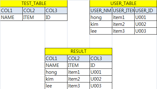 TEST_TABLE COL1 이 NAME 이면 USER_NM을 아래에 리스트로 뿌리고
