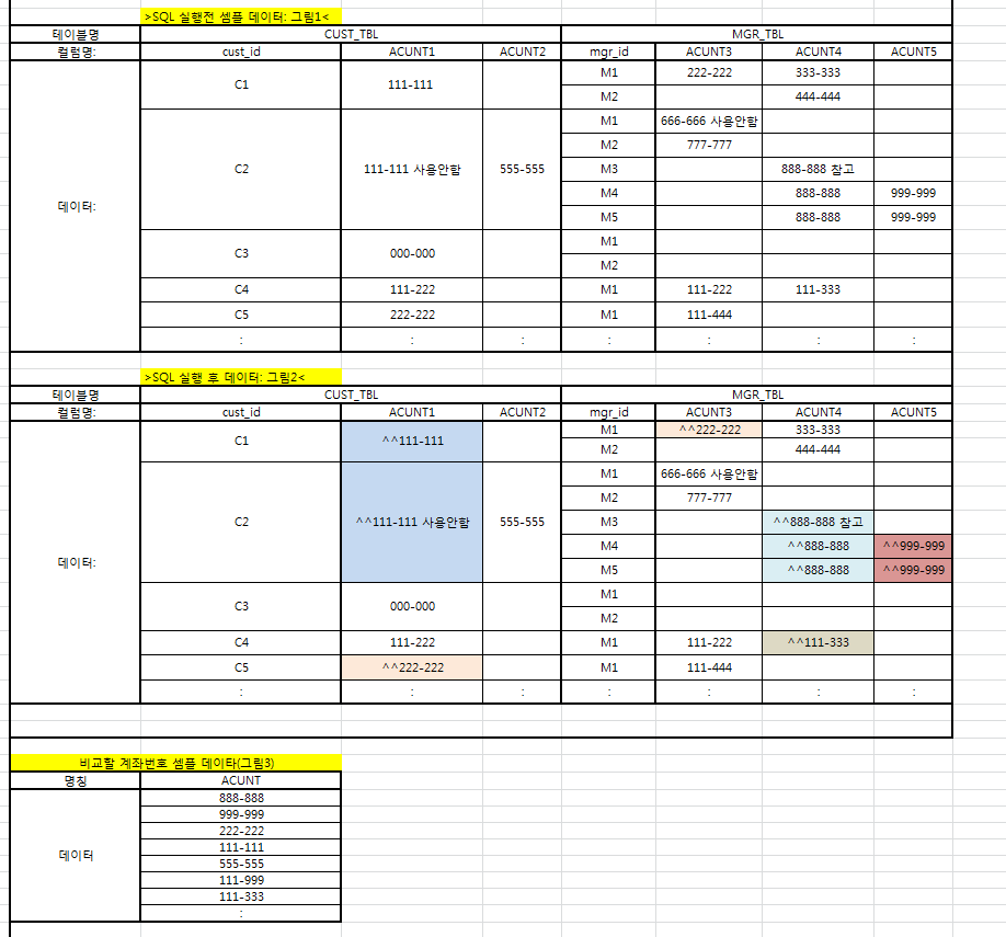 같은 계좌가 있으면 ACUNT1~ACUNT5 컬럼의 계좌번호앞에 "^^"를 삽입하는 것입니다(그림3 참조).