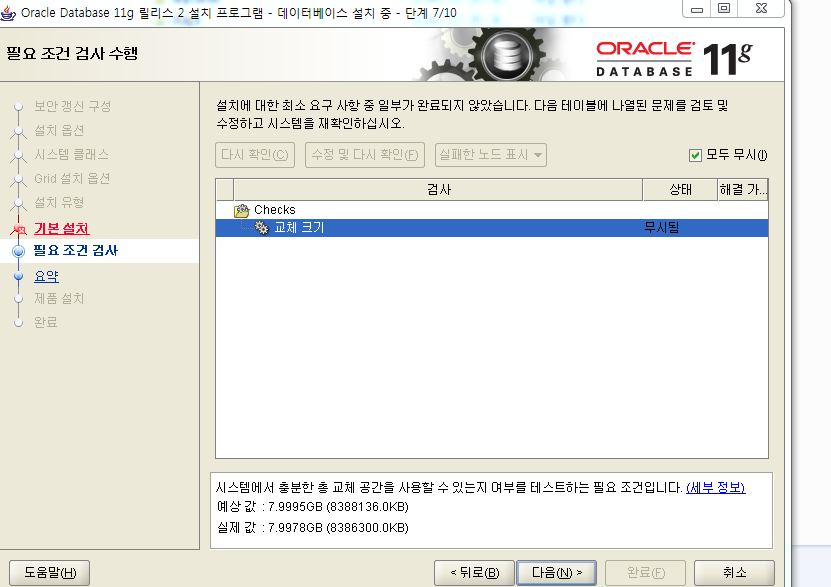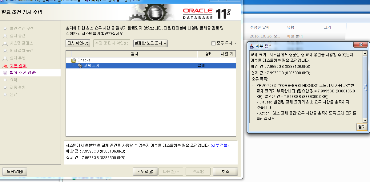 PRVF-7573 : "FOREVERSKHD34D2" 노드에서 사용 가능한 교체 크기가 부족합니다. [필요한 값 = 7.9995GB (8388136.0KB), 발견된 값 = 7.9978GB (8386300.0KB)] - Cause: 발견된 교체 크기가 최소 요구 사항을 충족하지 않습니다. - Action: 최소 교체 공간 요구 사항을 충족하도록 교체 크기를 늘리십시오.