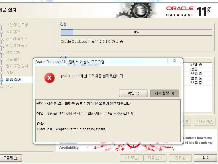원인 - 세션을 초기화하는 중 예상치 않은 오류가 발생했습니다. 작업 - 오라클 고객 지원 센터로 문의하거나 로그를 참조하십시오. 요약 - java.io.IOException: error in opening zip file