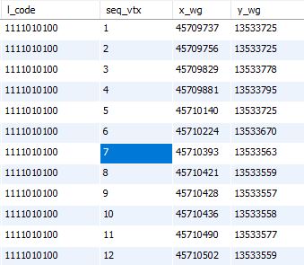 표에 l_code의 시퀀스(seq_vtx)로 나눠져서 x(x_wg), y(y_wg)좌표값을 가지고 있습니다(그림1참고). 이를 l_code로 self -join하여 하나의 컬럼에 넣으려고 합니다.