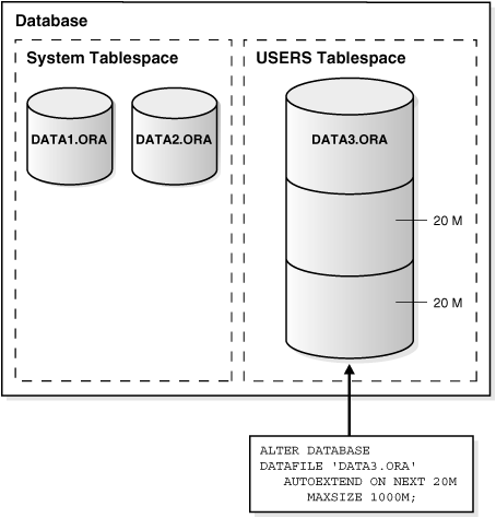 첫 번째는 기존의 테이블스페이스에 datafile을 추가함으로써 해당 테이블스페이스의 disk space 양을 늘리는 방법 입니다.
