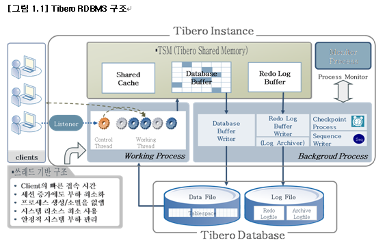Tibero RDBMS는 한정된 서버프로세스로 CPU 및 Memory 등의 시스템 리소스를 효율적으로 사용하면서 뛰어난 성능과 안정성 및 확장성을 보장하고 편리한 개발과 관리기능을 제공한다.