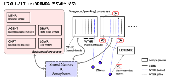 Tibero RDBMS는 대규모 사용자 접속을 수용하는 다중 프로세스 및 다중 스레드 기반의 아키덱처를 갖추고 있다. Tibero RDBMS의 프로세스 구조는 다음과 같다