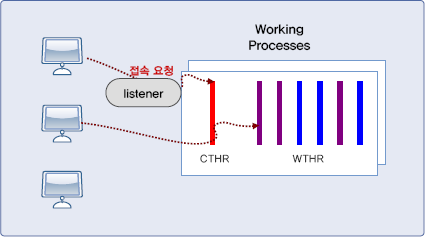 기본적으로 하나의 워킹 프로세스 안에는 1개의 컨트롤 스레드 (CTHR: control thread)와 10개의 워킹 스레드 (WTHR: Working Thread)가 존재한다.