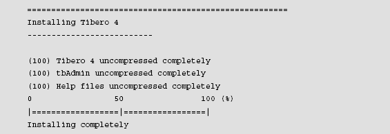 4. Tibero RDBMS 설치가 진행된다. 설치가 완료되면 아래와 같은 내용이 출력된다. 이때, 소프트웨어 복사와 링크 작업 그리고 DATA FILE PATH에 설정한 디렉터리에 데이터베이스를 생성하는 작업까지 모두 진행된다.