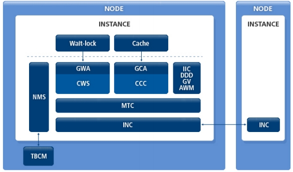 | CWS (Cluster Wait-lock Service) | 기존 Wait-lock(이하 Wlock)이 클러스터 내에서 동작할 수 있도록 구현된 모듈이다. Distributed Lock Manager(이하 DLM)이 내장되어 있다. Wlock은 GWA를 통해 CWS에 접근할 수 있으며, 이와 관련된 배경 프로세스로는 LASW, LKDW, RCOW 이 존재한다. Tibero RDBMS 3에서는 Wlock이 싱글 인스턴스의 리소스만 보호했으나, 멀티 인스터스를 지원하는 TAC 환경에서는 CWS를 통해 다른 노드와의 동기화를 통제할 수 있다. |