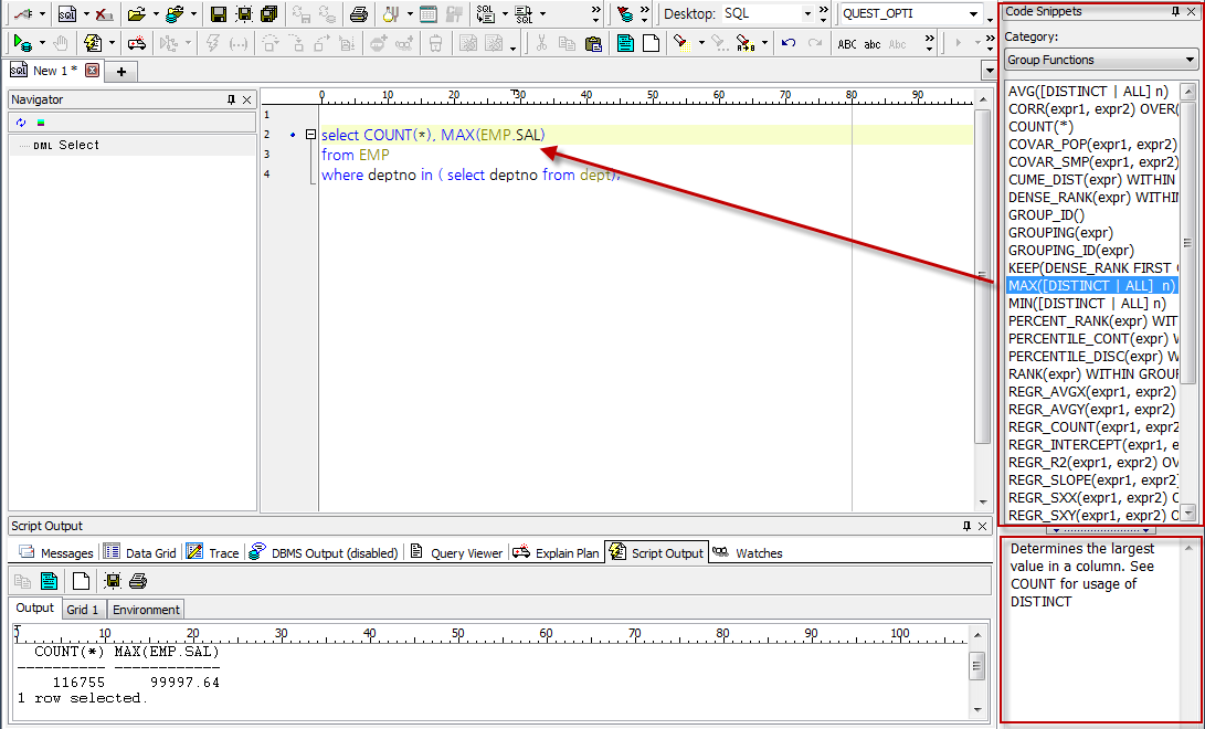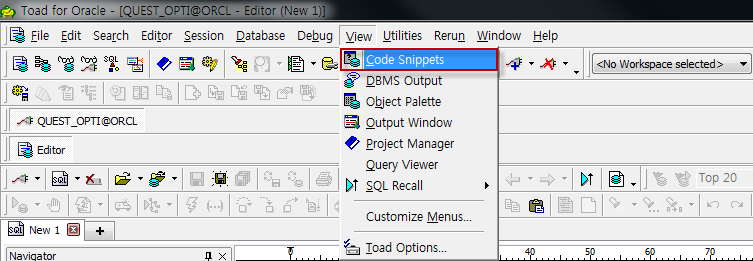 Code Snippets는 Date formats, 튜닝 힌트, 함수 등을 보다 쉽게 Editor창에 사용할 수 있도록 하는 기능입니다. Code Snippets를 실행하면 Editor창의 우측에 Code Snippets 창이 나타납니다.