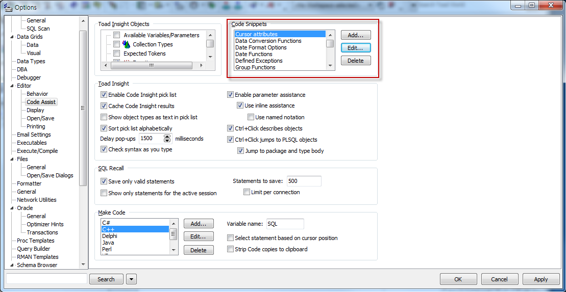 Code Snippets에서 기본적으로 제공되는 함수, 힌트, 코드 등을 수정하거나, 사용자가 직접 만든 함수를 추가하는 등의 작업은 Toad Options > Editor > Code Assist 화면 내에 Code Snippets 옵션을 이용하여 변경, 관리 할 수 있습니다.