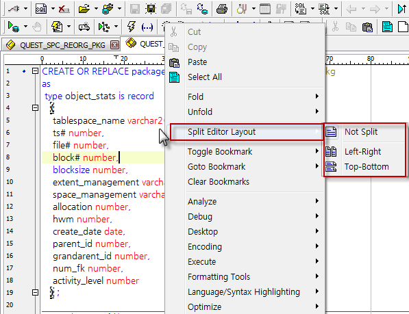 제가 사용하는 TOAD 7.2 버전에서는 우클릭 메뉴에 Split Editor Layout 을 찾지 못했는데요?