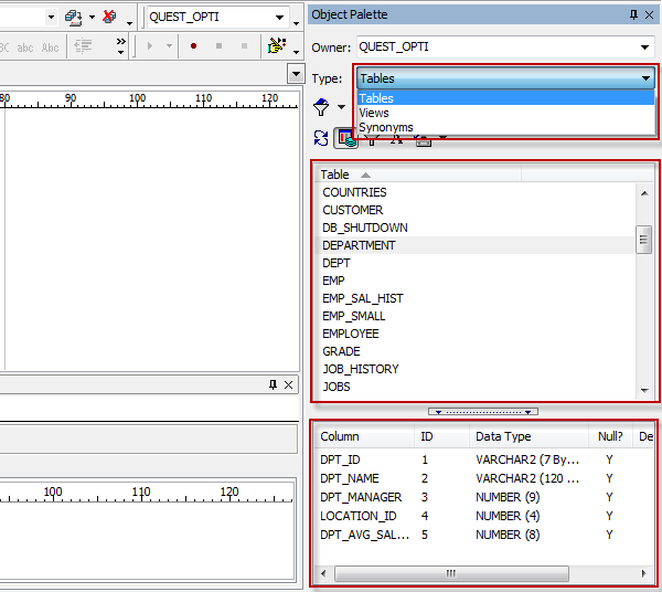 Object Palette는 실행하면 Toad의 Editor 오른쪽에 위치하게 되며 사용자가 테이블명 또는 컬럼명을 쉽게 찾고 호출하여 사용할 수 있도록 도와주는 기능입니다.