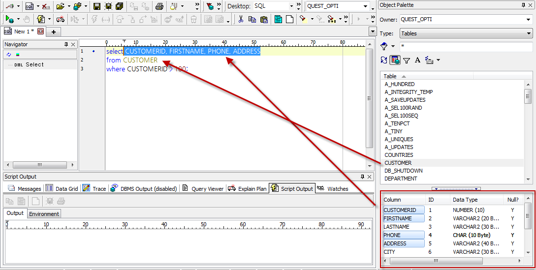 선택한 Object 및 컬럼을 Drag & Drop 또는 더블 클릭으로 Editor에 복사해서 사용할 수 있습니다. (한번에 여러 항목을 선택할 수 있습니다)