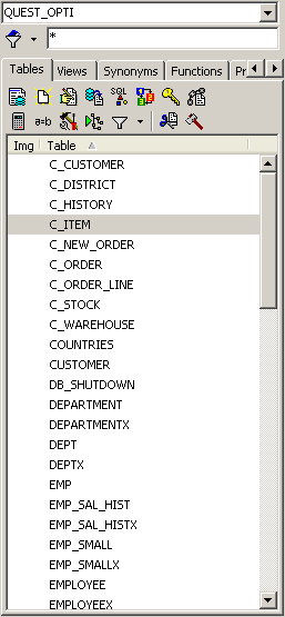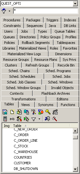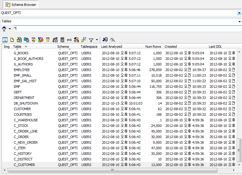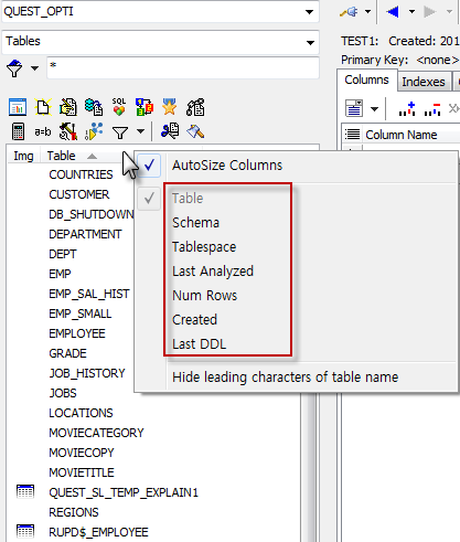 오브젝트 패널의 Object명 그리드 탭에서 마우스 오른쪽 버튼을 클릭하면 추가적으로 다른 칼럼 명을 볼 수 있습니다. 테이블인 경우는 기존 테이블 명 뿐만 아니라 Schema, Tablespace, Last Analyzed, Num Rows, Created, Last DDL 정보를 볼 수 있습니다.