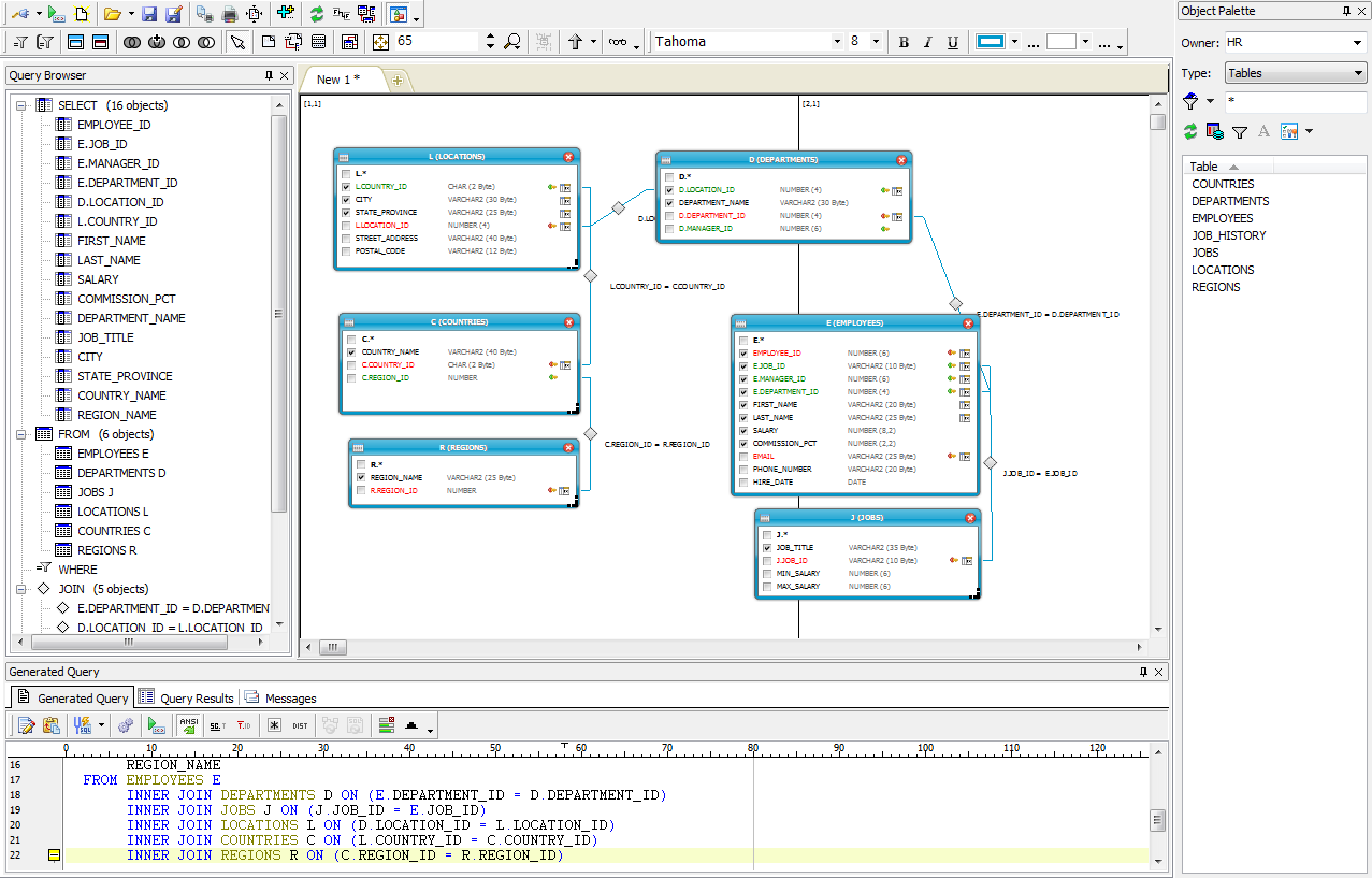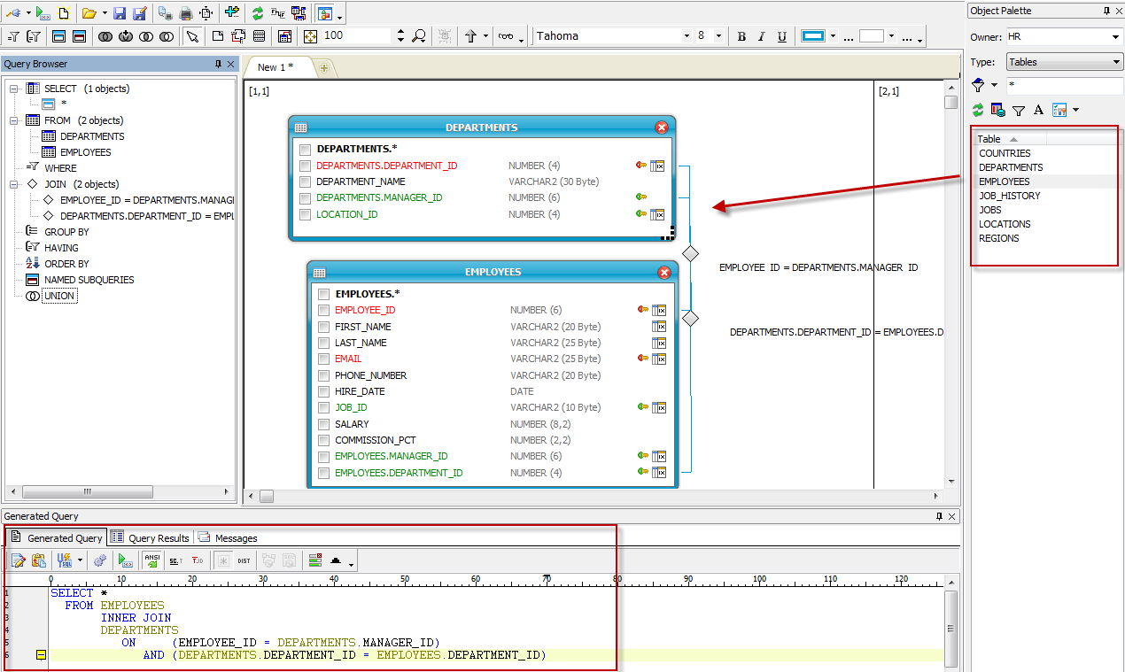 Object Palette에서 테이블 또는 View를 선택하고 Drag & Drop 방식으로 Query Builder 화면으로 이동시키면 [그림2]와 같이 Object간의 연관관계가 나타나고 화면 아래쪽 Generated Query에는 SQL 문장이 자동으로 생성됩니다.