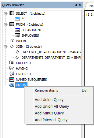 화면 위쪽에 툴바 또는 화면 왼쪽의 Query Browser를 이용하여 Union, Subquery, where절 또는 Having절 등 조건들을 추가해서 사용할 수 있습니다.
