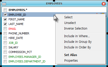 Query Builder에 Drag & Drop 방식으로 생성한 테이블의 Column 체크박스를 통해 조회하고자 하는 Column을 선택할 수 있고, 마우스 오른쪽 버튼을 이용해 나타난 팝업창에서 Where, Group By, Order By 조건을 설정할 수 있으며, 선택한 Column의 Alias를 입력할 수 도 있습니다.