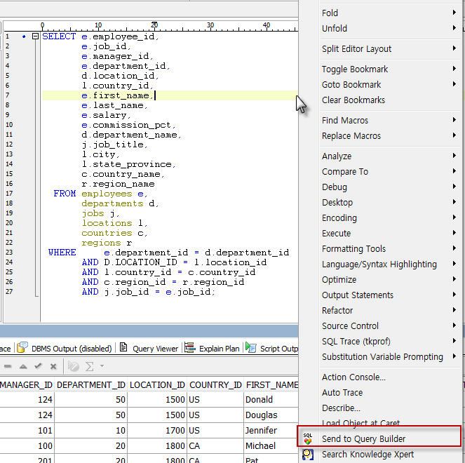 [그림5]와 같이 복잡한 SQL문장도 마우스 오른쪽 버튼을 클릭해서 나오는 기능 중에 Send to Query Builder를 클릭하면 [그림6]과 같이 테이블간의 연관관계를 도식화 할 수 있습니다.