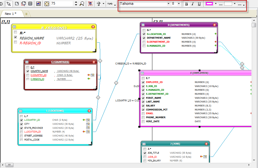 도식화된 테이블 정보는 특정 영역을 확대, 축소하거나 전체 영역을 화면에 자동으로 맞춰주는 기능(Auto layout) 등 화면에 대한 유연한 기능을 제공하고 있으며, 글씨체나 색상, 밑줄, 글자 크기 등 사용자 기호나 중요도에 따라 다양하게 속성을 변경할 수 있으며, BMP, PNG 및 JPEEG 형식으로 저장할 수 있습니다.