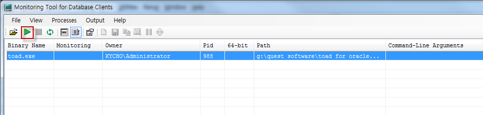 녹색 화살표 아이콘을 클릭하면 Toad를 사용하여 Database에 수행되는 SQL 문장을 SQL Tracker에서 확인할 수 있습니다.