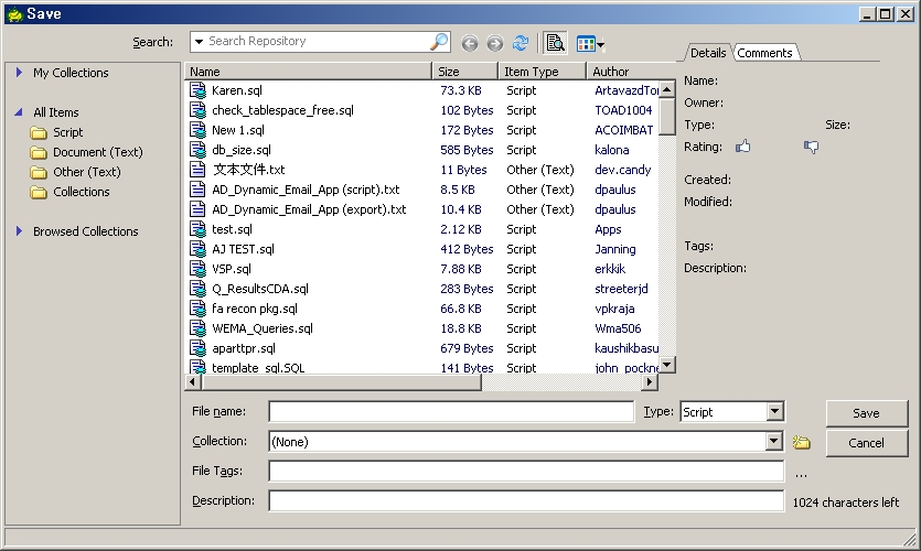 Toad World Repository이 실행되면 기존의 스크립트를 확인할 수 있습니다. 파일을 선택하면 관련된 정보를 보여주고 Like, Dislike, Bookmark 등을 수행할 수 있습니다.
