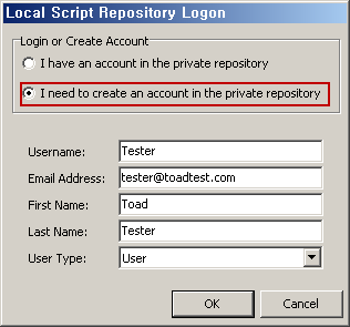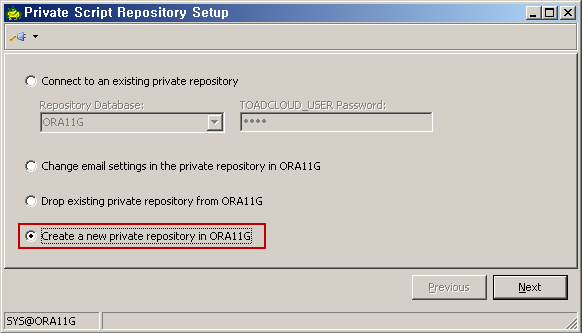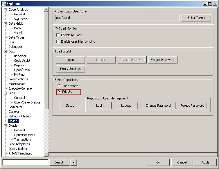 실행 방법은 View > Toad Options > Online > Script Repository > Private 로 이동합니다.