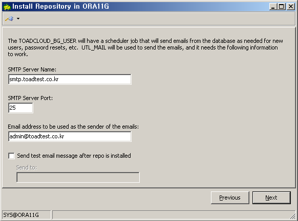 SYS.UTL_MAIL을 사용하기 위해서는 @?/rdbms/admin/utlmail.sql, @?/rdbms/admin/prvtmail.plb를 실행하여 설치해야 합니다.
