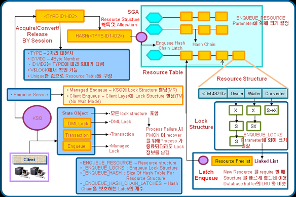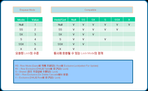 이와 같은 Enqueue Mode에 의해 Enqueue Compatible 표를 확인해 보면 V 마크가 되어있는 경우에는 공유가 가능한 Enqueue는 위에서 확인한 것과 같이 Enqueue Mode와 Compatible 표에 의해 Resource Structure를 어떻게 이용하는가에 따라 운영된다.
