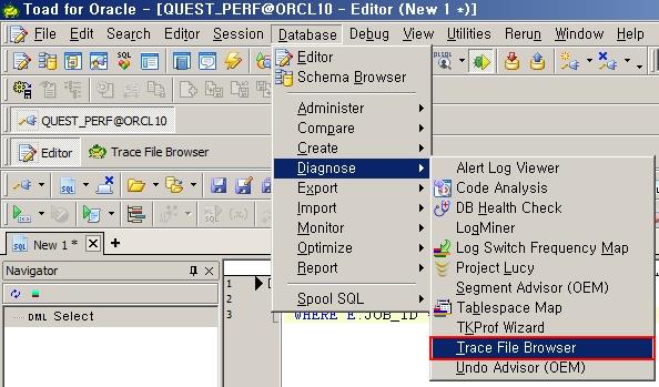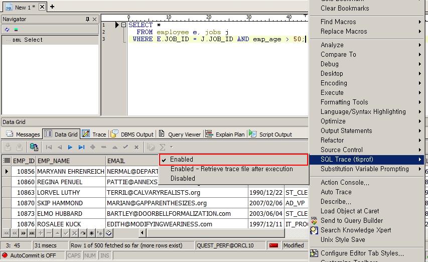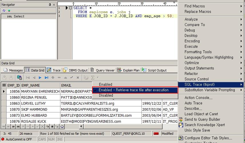 SQL Trace기능은 Editor 창에서 마우스 오른쪽 버튼을 눌러 SQL Trace (tkprof)에서 Enabled를 선택하면 됩니다.