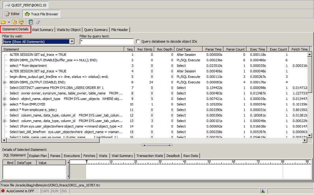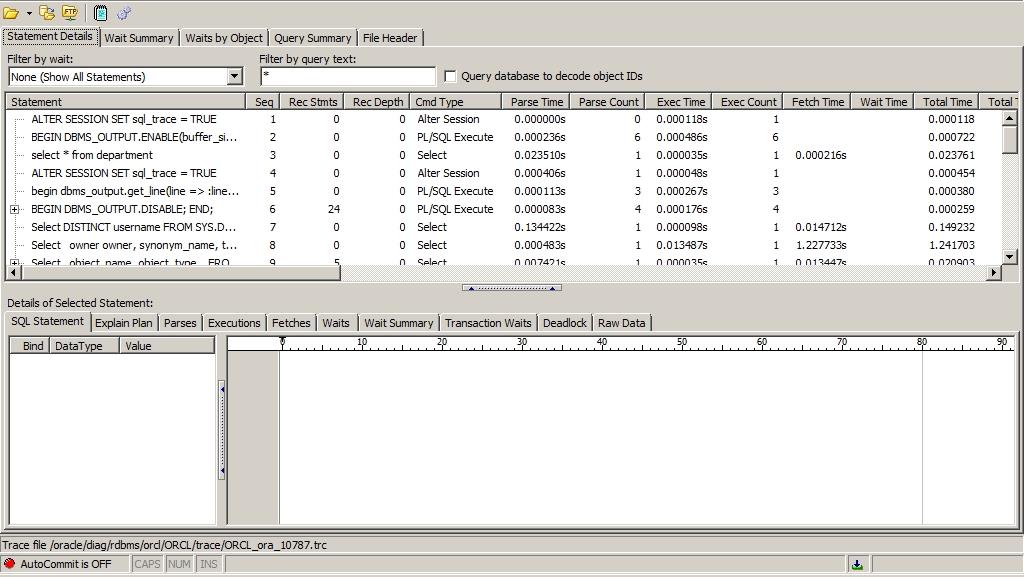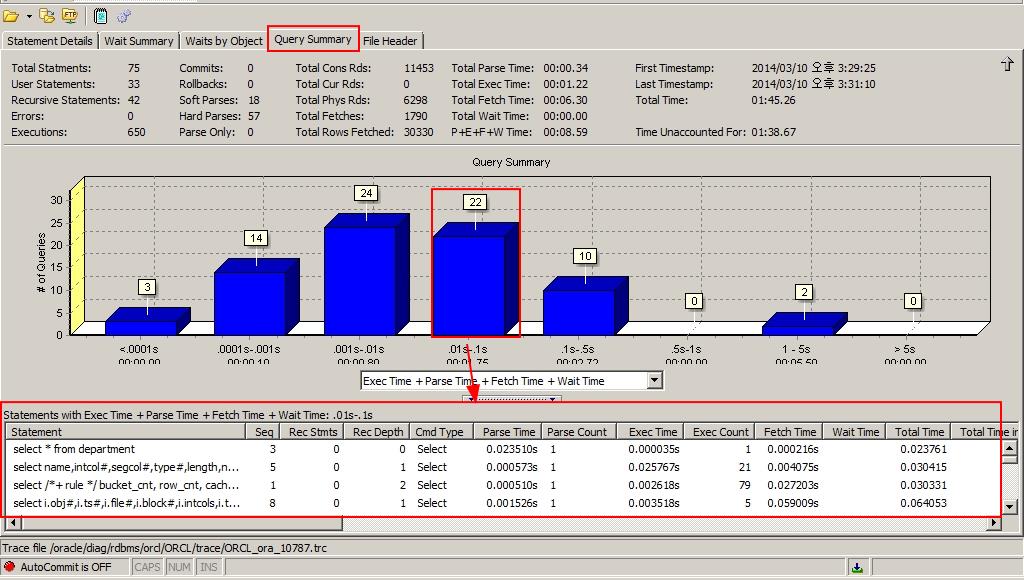 또한 전체적인 통계치를 보고 싶다면 Query Summary를 선택하고 Trace File 내의 모든 쿼리를 수행 시간대 별로 분류한 그래프를 보여줍니다. 각 그래프를 클릭하면 화면 아래 세부 정보들을 확인할 수 있습니다.