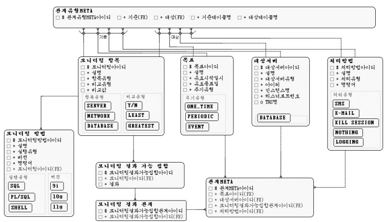 관계META는 목표와 대상서버, 모니터링 결과, 처리방법의 관계의 메타 정보를 담는 곳이다. 그리고 관계유형META는 목표와 모니터링 항목의 관계 목표와 대상서버의 관계, 목표와 처리방법의 관계 등의 엔티티 2개 간의 관계를 저장하는 참고용 META 코드테이블로 볼 수 있다.