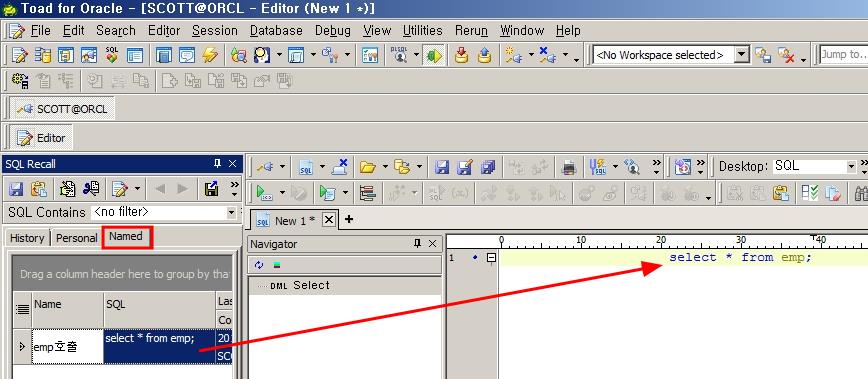 Menu > View > SQL Recall > Named탭을 선택하거나 단축키 F8을 눌러 Named 탭에 가면 저장된 SQL을 확인할 수 있습니다. 앞선 SQL Recall 기능과 마찬가지로 더블 클릭 혹은 Editor로 드래그하여 사용 가능합니다.