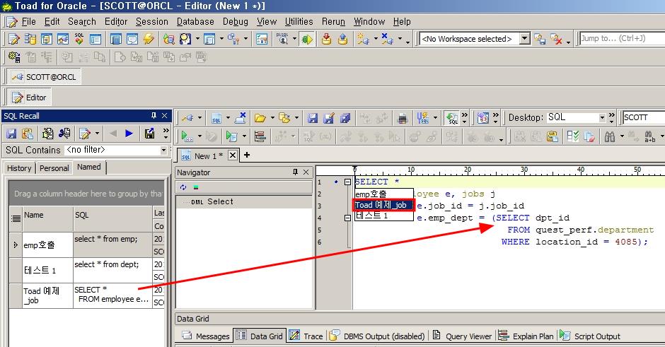 SQL Recall을 이용하면 수행한 모든 쿼리에 대한 히스토리를 남길 수도 있고 사용자가 원하는SQL을 따로 Personal SQL영역에 저장 후 사용할 수도 있습니다. 그리고 저장하는 SQL에 이름을 지정하고 그 이름을 이용해서 쉽게 호출할 수 있는 Named SQL이라는 기능도 있습니다.