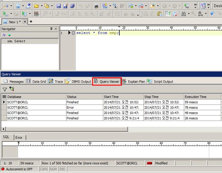 Query Viewer는 SQL Recall과 Editor 창별로 이력이 남게 됩니다.