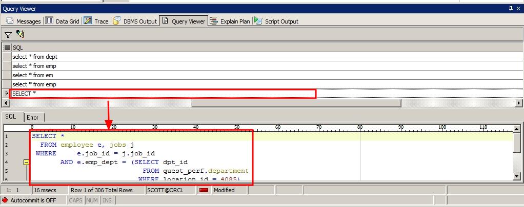SQL의 수행 이력을 확인하기 위해서 SQL Recall을 이용할 수 있습니다. 그러나 SQL Recall은 단순한 SQL문에 대한 기록만 남기기 때문에 상세한 정보를 확인할 수는 없습니다. Toad는 이와 같은 SQL Recall의 취약점을 보완하고자 상세한 SQL 수행 이력을 확인할 수 있는 Query Viewer라는 기능을 제공합니다.