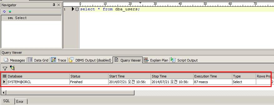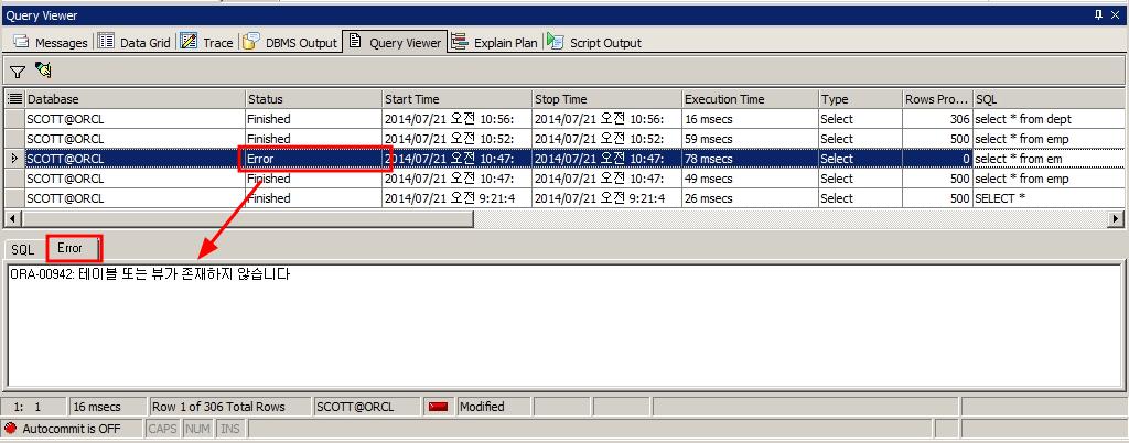 Query Viewer는 수행 중 실패한 SQL문에 대해서도 이력을 남기고 Status가 Error인 SQL문에 대해서는 Error 탭에서 오류 내용을 확인할 수 있습니다.