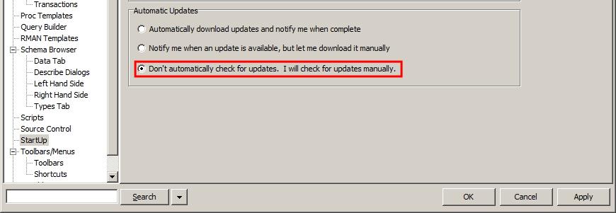 다음은 토드가 시작될 때 수행되는 일들에 대한 설정입니다. Menu > View > Toad Options에서 Startup을 선택합니다. 기본적으로 토드가 처음 시작할 때 접속 창이 뜨는데 Show login window 옵션에 체크를 해제하면 아무 창도 뜨지 않습니다.