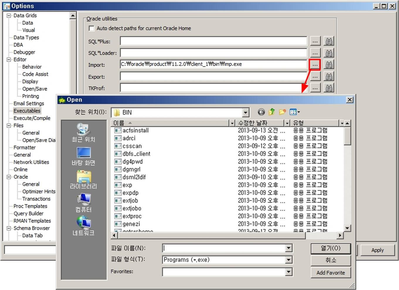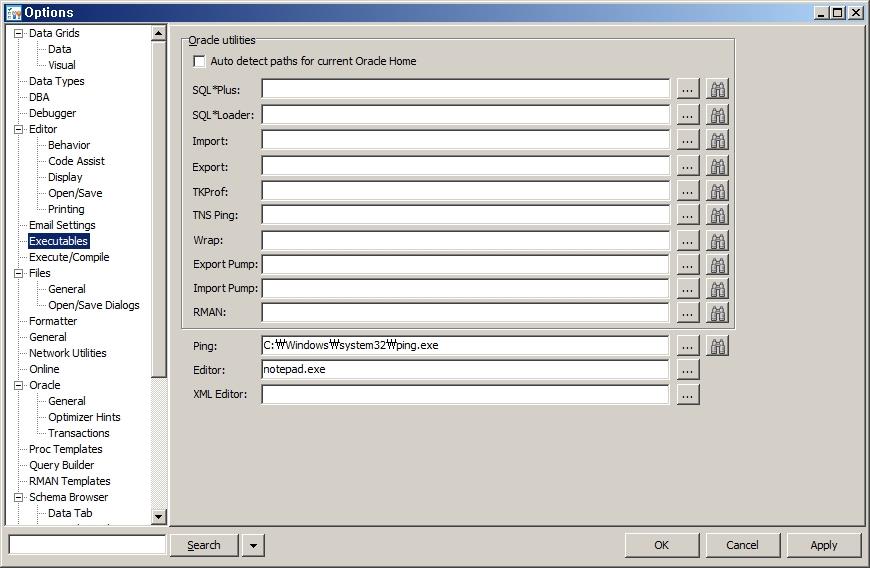 토드에서 사용하는 많은 유틸리티 즉, export나 import, tnsping 등은 오라클 클라이언트가 가지고 있는 오라클의 유틸리티를 사용합니다. 따라서 토드에서 이 기능을 정상적으로 사용하기 위해서는 실행 프로그램을 연결시켜 줘야 합니다. Menu > View > Toad Options에서 Executables을 선택하면 확인할 수 있습니다.