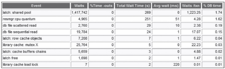 Literal SQL을 수행하는 동한 발생한 이벤트 내용을 AWR Report에서 확인하면, Literal SQL로 인해 latch: shared pool wait event가 발생했고, Shared Pool 크기 증가로 Library Cache를 탐색하는 시간과 latch 보유시간도 길어졌다.