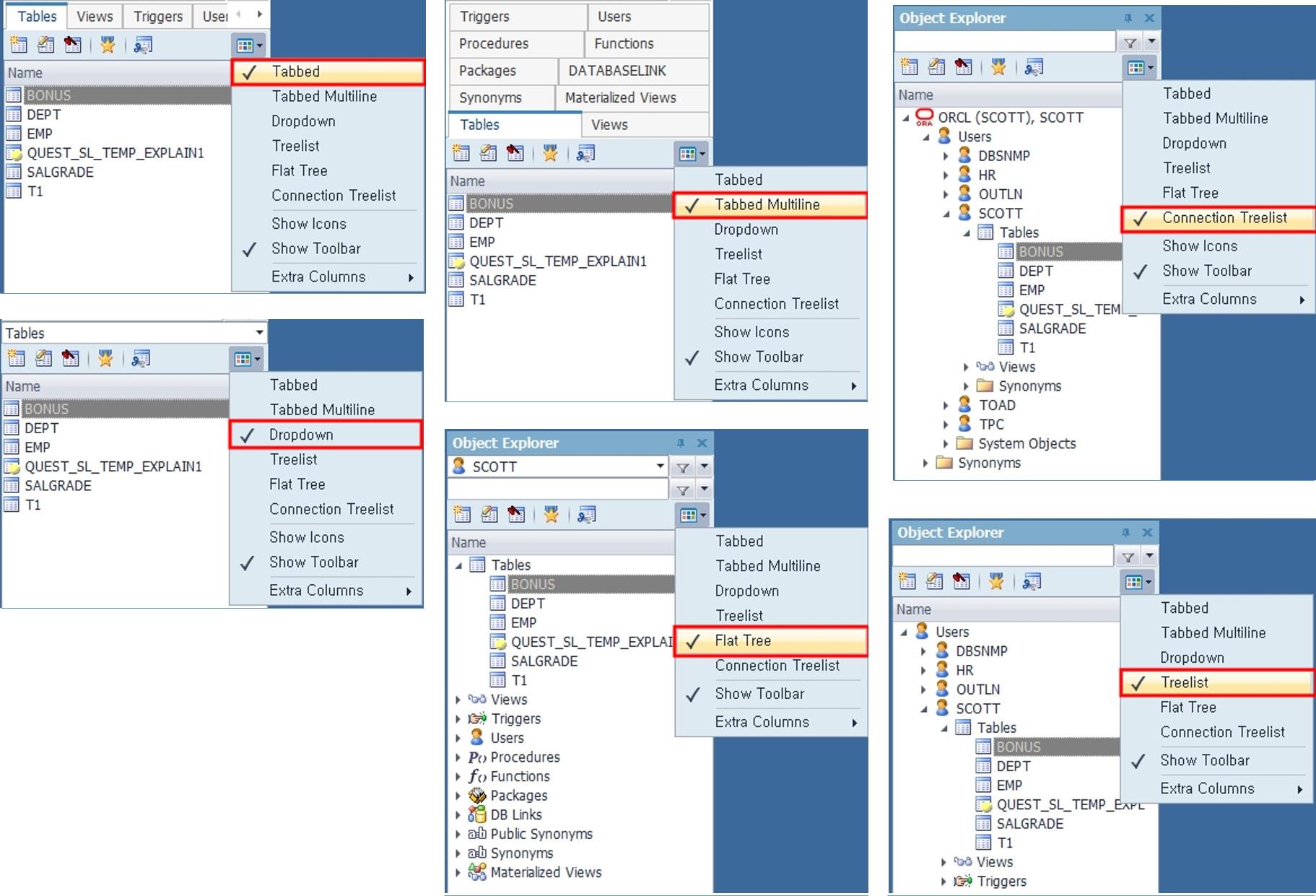 Object Explorer의 옵션을 이용하면 오브젝트 리스트를 보여주는 방식을 변경할 수 있습니다. Tabbed, Tree 등 6가지 형태를 가집니다.