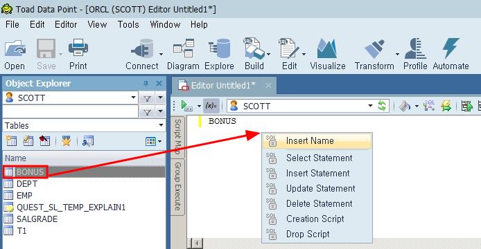 또한 오브젝트명 또는 컬럼명을 에디터 창에 드래그 앤 드롭(Drag & Drop) 하면 바로 입력이 가능한데 자동으로 Select 및 DML 쿼리를 만들어서 생성할 수 있습니다.