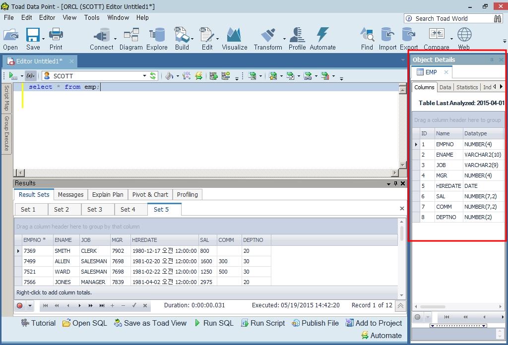 Toad Data Point는 SQL문을 작성할 때 도움이 되는 몇 가지 편의 기능을 제공합니다