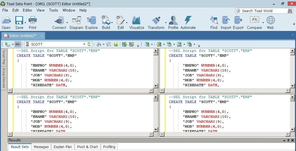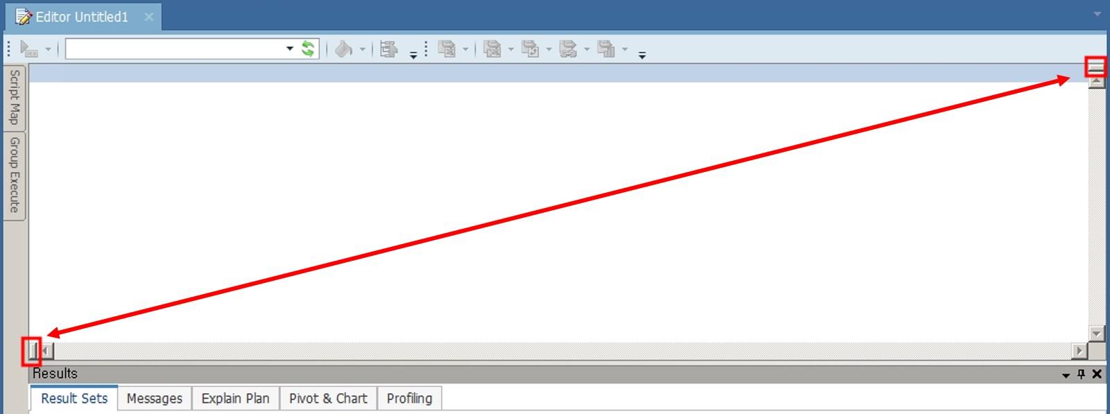 Toad Data Point는 Editor 창을 2등분이나 4등분하여 동시에 사용할 수 있도록 지원합니다. 상하(Top-Bottom) 분할하기 위해서는 Editor 창의 오른쪽 윗부분을, 좌우(Left-Right) 분할을 하기 위해서는 Editor 창의 왼쪽 아래 부분을 마우스로 드래그하여 분할창 크기를 조절합니다