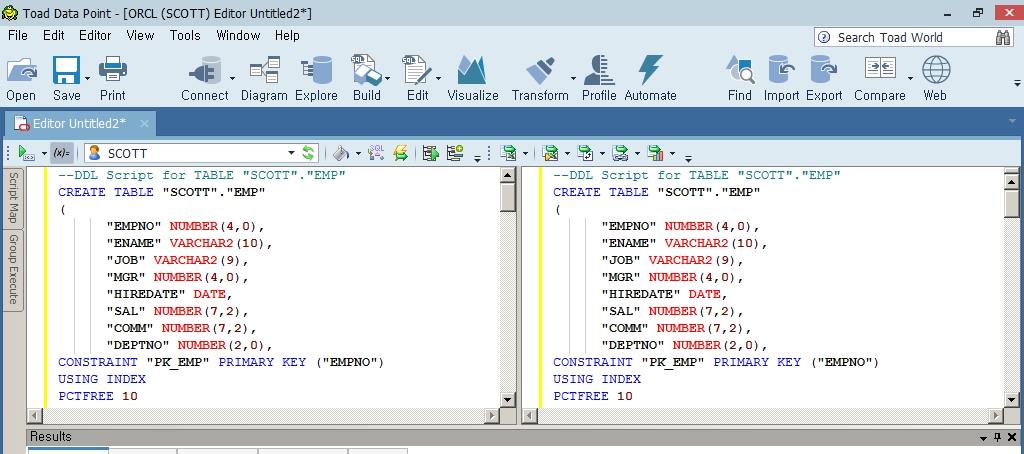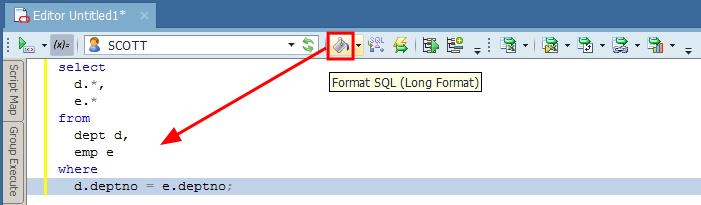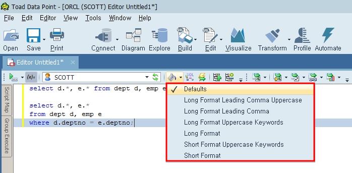 Toad Data Point 는 이런 문제를 해결하기 위해 SQL문장의 형식을 변형하는 Format SQL 기능을 제공합니다. 사용 방법은 Menu > Editor > Format Code를 선택하거나 툴바에서