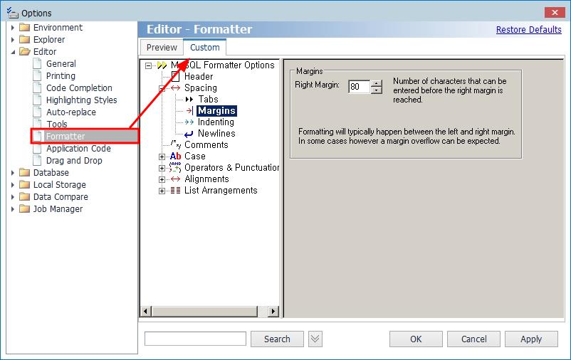 사용자가 임의로 Format 규칙을 바꿀 수 있습니다. Menu > Tools > Options을 선택해서 Toad 옵션 창이 나타나면 왼쪽에서 Editor > Formatter를 선택합니다. 오른쪽 화면에서 Custom 탭을 클릭하면 여백, 대소문자 등을 규칙을 변경할 수 있습니다.