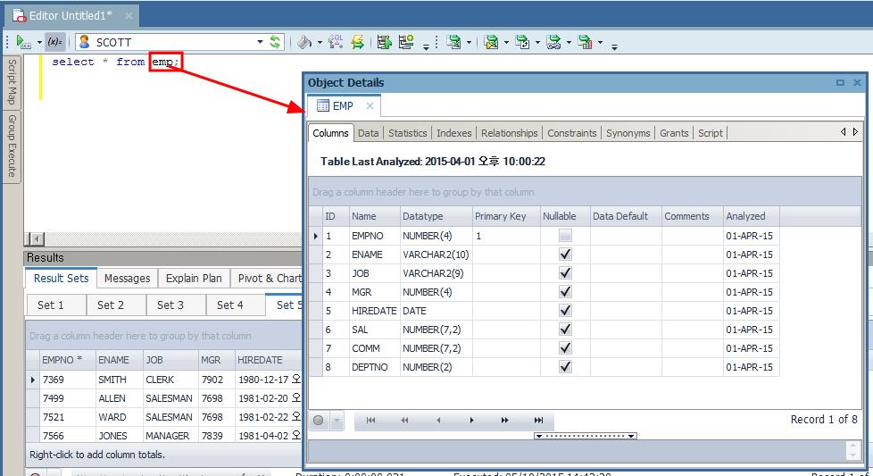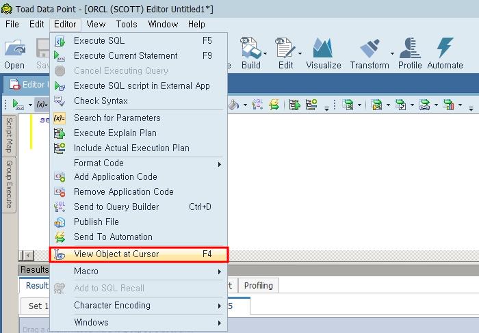 Toad Data Point에서는 테이블의 정보를 보기 위해서 Object Explorer를 제공합니다. Editor 창에서도 간단하게 테이블 정보를 확인할 수 있는데 Editor에서 테이블이름에 커서를 두고 Menu > Editor > View Object at Cursor 혹은 단축키 [F4]를 누릅니다.