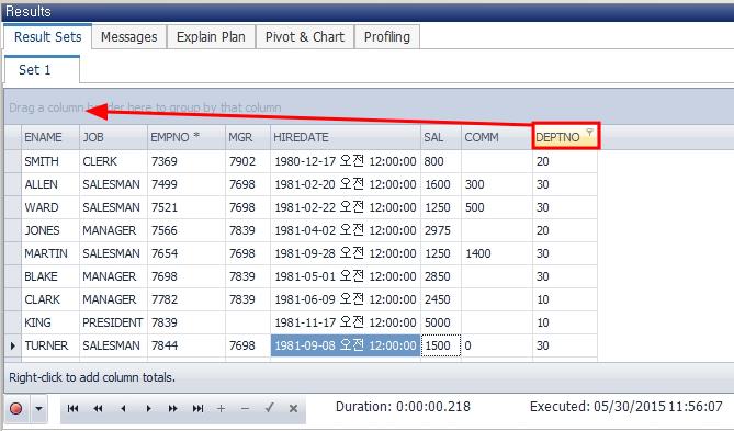먼저 Result Set의 윗부분을 Group By Box라고 부르는데 컬럼을 마우스로 드래그하면 해당 컬럼을 기준으로 데이터를 그룹 지을 수 있습니다.
