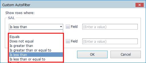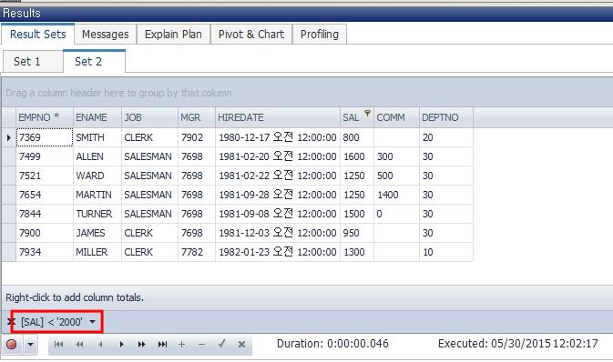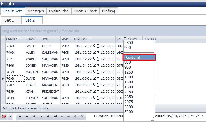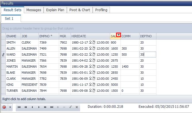 깔대기 버튼을 누르면 이 컬럼이 가지고 있는 전체 값을 보여줍니다. 이 중에서 값을 선택하면 그 값에 해당하는 데이터만 표시합니다. 창의 아래 부분에는 필터링된 조건을 보여줍니다. Where 절을 이용해서 SQL문을 다시 실행하지 않아도 원하는 값을 확인할 수 있습니다.