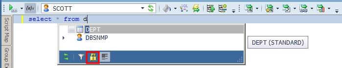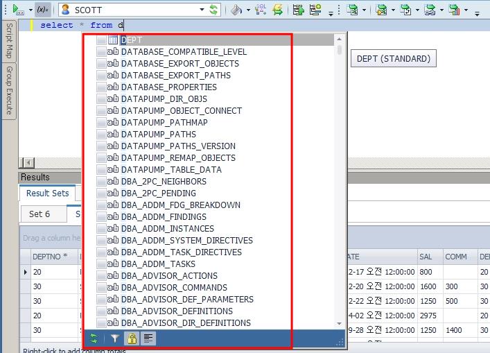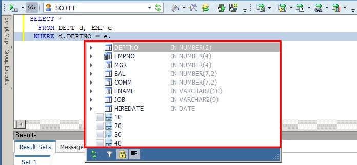 Editor 창에서 SQL을 작성할 때 오브젝트나 컬럼을 쉽게 찾을(입력할) 수 있도록 팝업 창을 보여주는 기능을 제공합니다. 이 기능을 Code Completion List라고 하며 마침표(.) 또는 단축키 Ctrl + 마침표(.)를 누르면 됩니다.