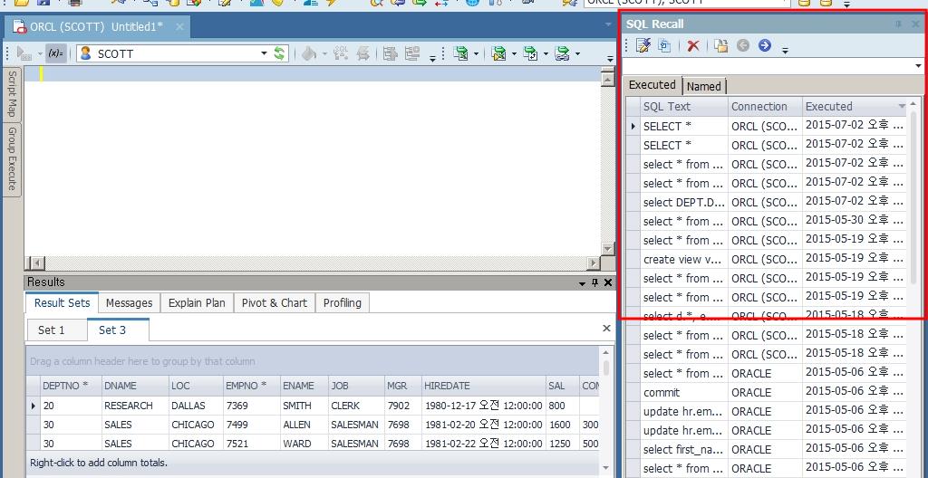 SQL Recall은 일반적으로 화면의 오른쪽에 생성되는데 SQL문, 접속 정보, 실행한 날짜, SQL 수행 시간에 대한 정보를 볼 수 있습니다.